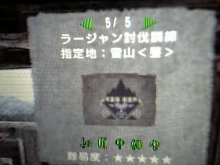 祖龍行かないで訓練所に引きこもって もっさい武器防具で一通り全武器クリアした …ラージャン以外… 先日村ージャンx2を攻略した際、 訓練所最後の難関 「ラージャン全武器討伐指令」を 出現させる事に成功した訳で 0.3時間ほど採取出来る物を調べて 一番のネックのランスで採取物の (もちクリア見越して)シュミレートをしてみたが、 足止めは麻痺罠しかなく、 閃光段5個持っててもフラフラ動き回るラーには 爆弾当てられる隙が無い… 1回目は秘薬使ったが死亡した… 砥石温存の為、ザコは無視してたが 白ランポスから眠り投げナイフが パクれる事が解り 罠ボム眠りボム秘薬で 楽に討伐成功。 ランスが終われば俺のターンだ!? 剣聖ピアスは目の前だっぜ!?