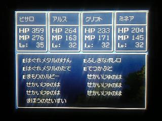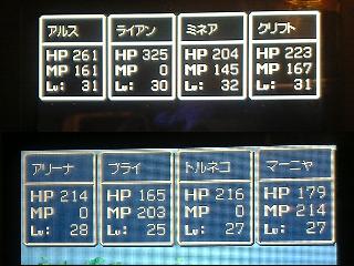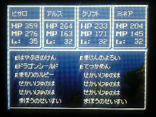 ========= 隠れダンジョンがあるらしいと、ヒントもなしに闇雲に探し回る。 ゴットタウンでNPCがいつもと違うセリフをしゃべってるのに気づき歩き回って入り口発見。 マグマ地帯だったり、巨人の家だったり、塔だったり、 まあさすがラストダンジョンって感じのカオスっぷりだwww で、奥にはめちゃめちゃ動きまくってるNPCがいるんだが 2匹いるし、ボスっぽくないし・・・ けど、ボスなんだろうなー・・・と話すと・・・・・ボスだった・・・・ エグ&チキで多くて3回攻撃・・・ エグは輝く息・波動に、チキは正拳突やら回し蹴り、羽防御・・・・ 即死亡・・・・・・・・・・・ やはりメインパ-ティは 勇:みなごろルカナン、攻撃、ベホマ、時の砂 雷:攻撃、祝福杖 栗:スクルト、氷の刃、ベホマラー 峰:フバーハ、賢者石、ベホマ (ここまでくる道中になんとメタルキングを倒してしまい、ここにきてミネアがフバーハ覚えてくれた>< いやいや、フバーハ無いと即死に輪をかけて1ターン撃墜だしなwww) 戦略は波動と2匹で一番の総ダメージ量を出す輝く息を使うエグ先行撃破! 星降る腕輪をミネアに着けフバーハで息対策 1ターン目は防・防・スクルト・フバーハ 2ターン目は武器ルカナン・攻撃・スクルト・賢者 3ターン目は攻・攻・攻orベホマラ・賢者 以降、フバーハとスクルトを絶やさないように回復しながら攻撃 波動が来たら↑を1ターン目から繰り返す。 エグが後攻なので無防備で息&回し蹴りはほとんど無いはず。 後は偶然勝利待ちwwwwwwww ======== でも勝ちは勝ち!